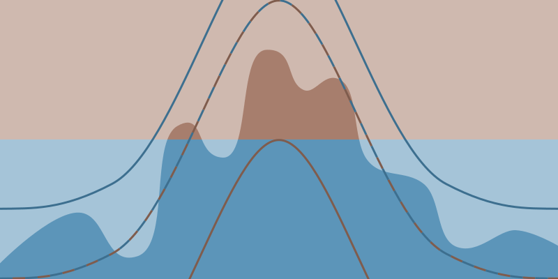 One scalar field can be used for the lower bound and another the upper bounds. They will define a range of value for every point of the surface and the noise will be stretched in between. They can be built with hills like in the following illustration to give the general shape of the island.