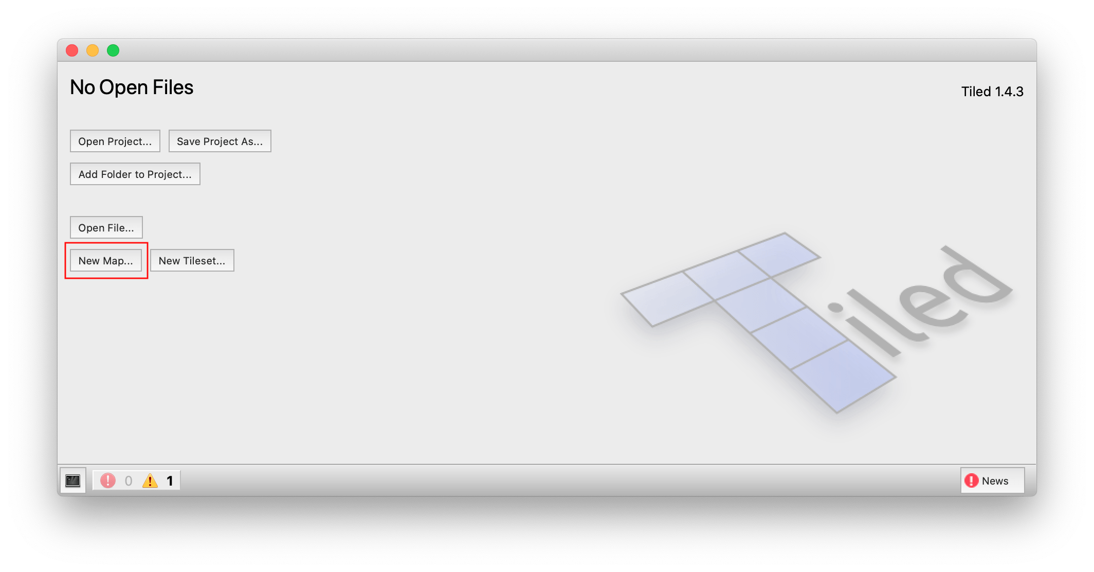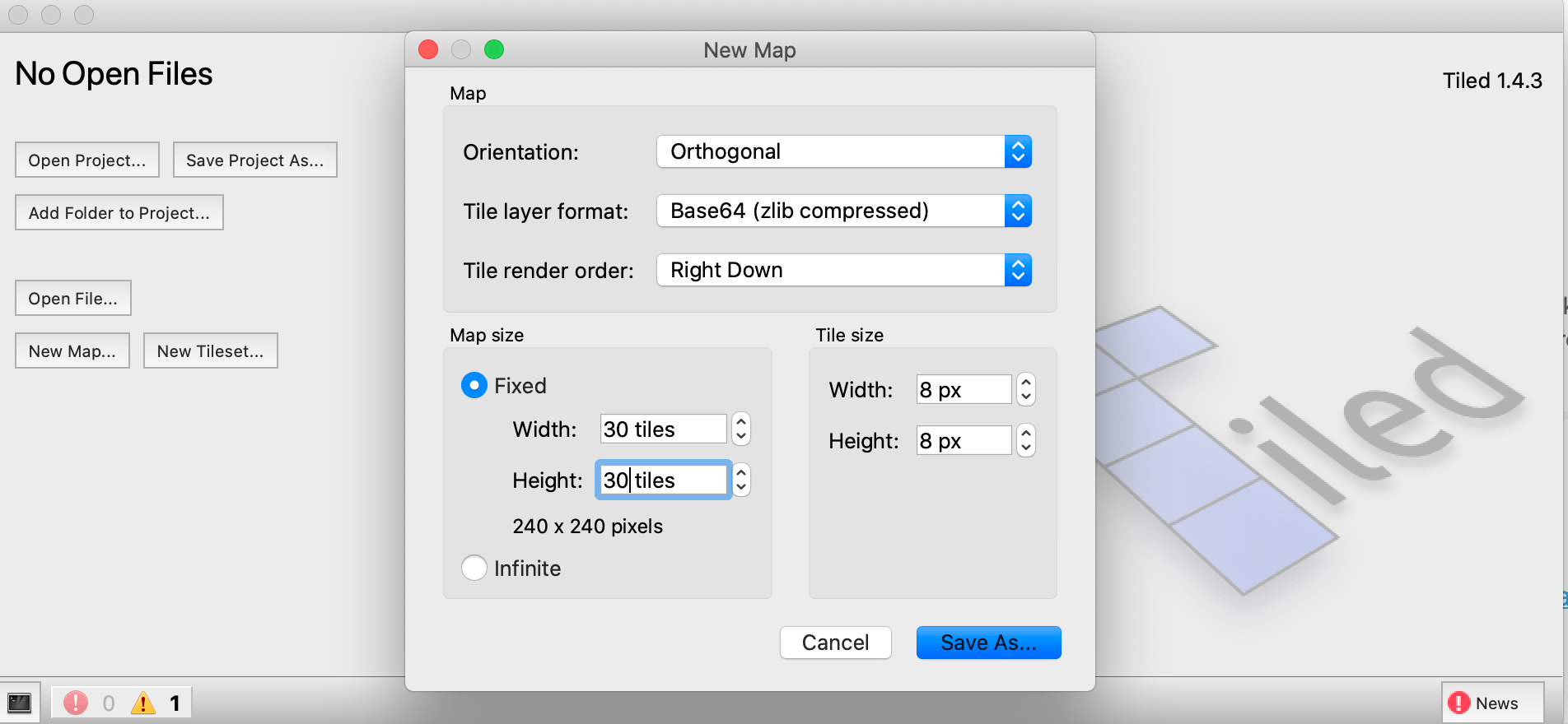 Download Tiled on mapeditor.org and launch it. Choose to create a New map...: