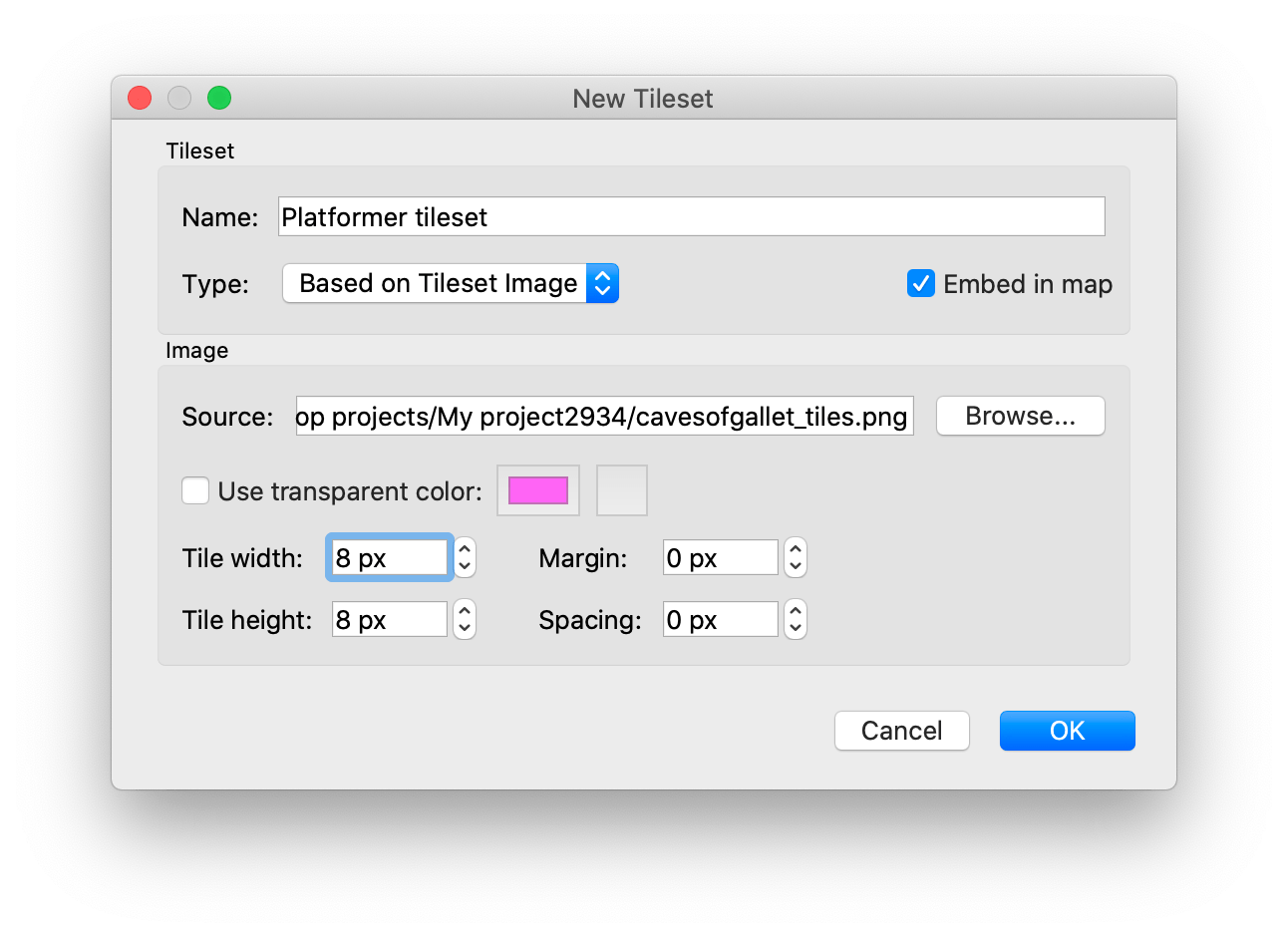 You can choose Embed in map so that the tileset data is stored inside the Tilemap JSON file. If you don't, you'll be asked where to save the Tileset JSON file, and you'll need to select this file in GDevelop too when setting up the tilemap. See the section "Choosing between a bundled or external tileset".