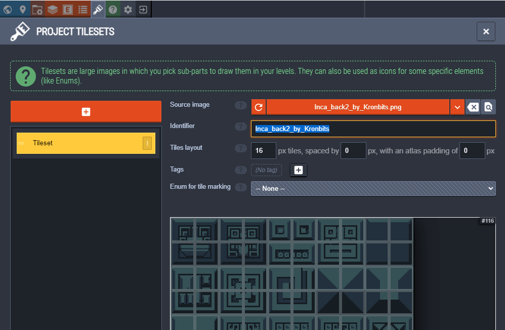 - Click the plus + button to add a new tileset. A file browser will popup.