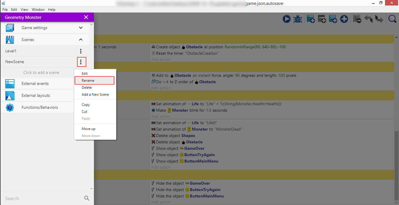 Since we now know how to switch between scenes, let's do this for the Try Again button we've created earlier on, but haven't implemented the actual action yet. Click on the "Level1 (Events)" tab, and "Add a condition".