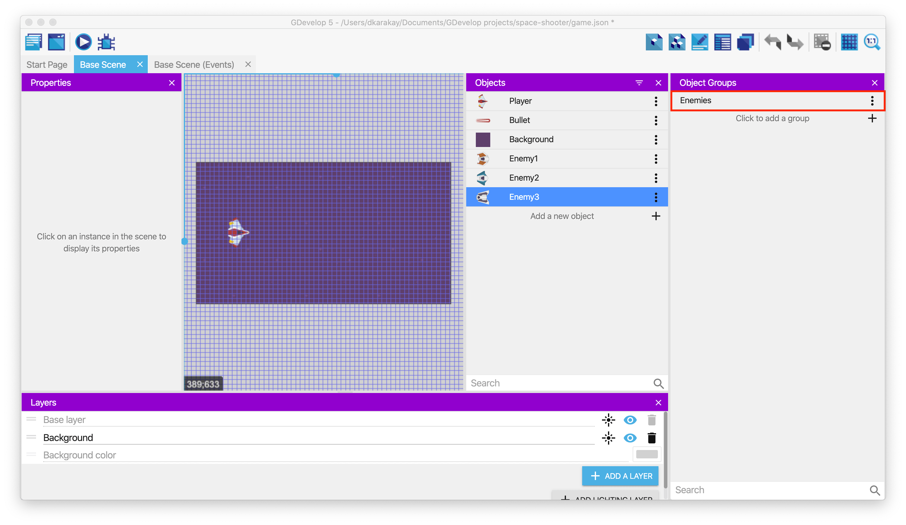 We'll now create an object group called "Enemies". This will be useful in events, to refer to all the objects in the group without repeating events for each object.